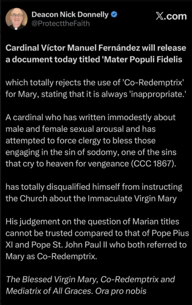 And now in 2025 we have soft-porn writer Cdl. Fernandez ironically using the word “inappropriate” to tell the faithful they should not honor the Mother of God as “Co-Redemptrix.”