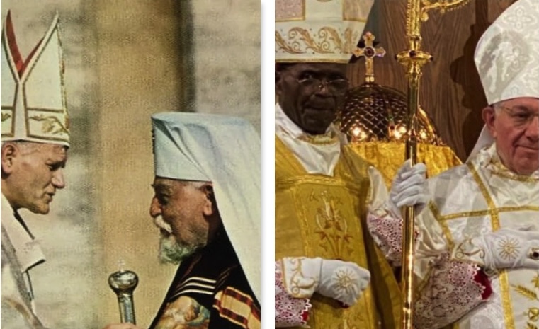 Above-left is Pope John Paul II with Cardinal Slipyj (p/c OnePeterFive) and above-right is Archbishop Telesphore George Mpundu with Bishop Anthony Ward (p/c Cathinfo.)