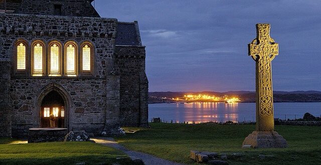 Notice the Irish couldn’t stay still.  O’Flynn rightly recognizes the stability of the Benedictines in Italy, but the Irish often saw their monasteries and hermitages as “citadels” or even a “base of operations” full of books to not only keep the faith, but also transmit the faith.  St. Columba founded the above abbey (see featured image above) in Iona, Scotland.