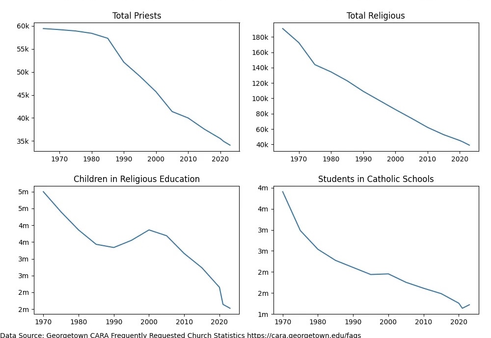 2) Reduction in priesthood numbers. As seen above, priestly vocations have tanked since the 1960s.